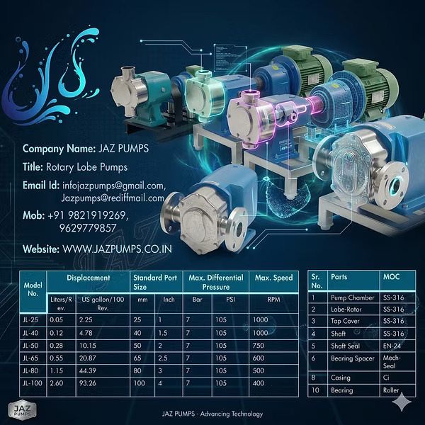 “JAZ PUMPS “is a premier lobe pump manufacturer, supplier, and exporter based in Mumbai, India. We specialize in high-quality rotary lobe pumps designed for efficient fluid transfer across the food, pharmaceutical, and chemical industries.Our “Model JL” stainless steel rotary lobe pumps are compact, bi-directional, positive displacement solutions engineered to handle corrosive chemicals, cosmetics, and high-viscosity liquids with ease.